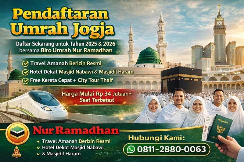 Pendaftaran Umrah Jogja bisa Anda mulai sekarang bersama Nur Ramadhan. Hubungi admin resmi di 081128800063 dan amankan seat terbatas sekarang.